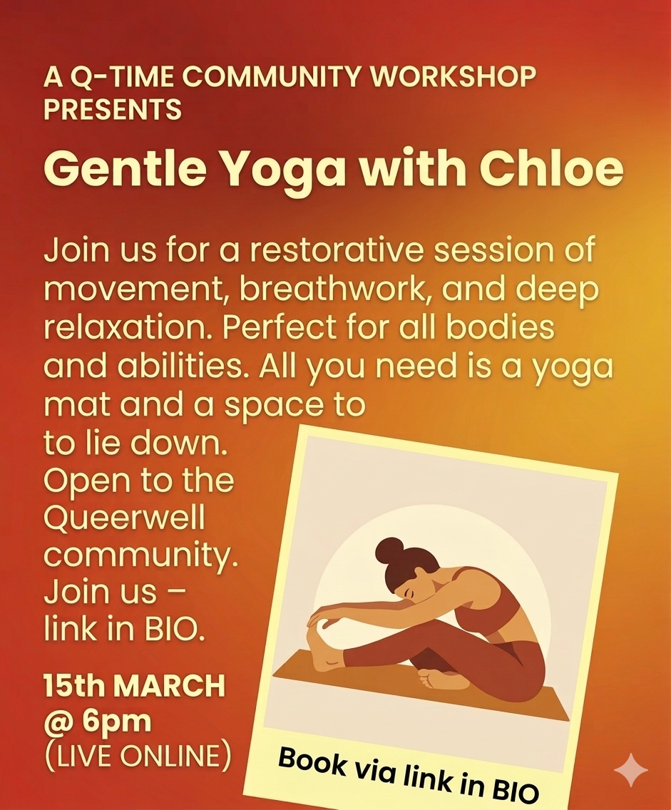 Our Queerwell session will be a largely restorative session blending some easy movement on our backs with some breathwork and relaxation techniques. All you need is a space to lie down, ideally on a yoga or pilates mat.